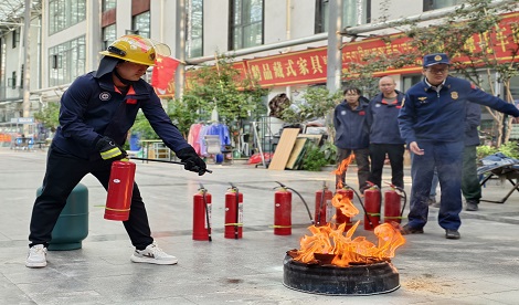 随后,针对高原地区火灾特点及野外作业常见隐患,申扎县消防救援大队参谋现场开展“灭火器使用教学”。他结合典型火灾案例,详细讲解了干粉灭火器“提拔握压”四步操作法,并特别提醒:“高原风大,灭火时要站在上风方向,保持2-3米安全距离,确保覆盖火源根部。”为强化实操效果,演练现场设置了“油盆灭火”模拟点。在消防队员指导下,项目组成员轮流上前操作,切实将“纸上知识”转化为“实战能力”。