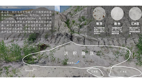 土堆洪积扇的表面分布着若干条辫状的通道,水系脉络清晰可见。水流最终汇入一个小水洼,即通常与洪积扇相伴的辫状河流和湖泊。不难想象,在降雨之后,水流从土堆高处汇集,加深并延长沟壑,形成并改善水流通道。当这些水流到达洪积扇表面时,大多呈现分散流动的状态并逐渐消失。由于缺乏长期的水流供给,扇面上仅留下辫状或树杈状的小沟渠。